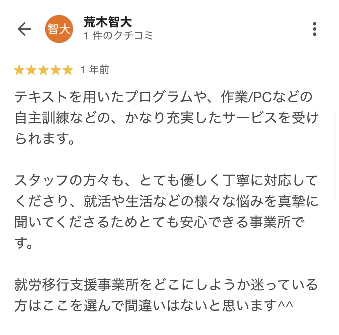 Screenshotリタリコに通って10カ月目ですがこの度、就職が決まり退所することになりました。リタリコワークスの皆さんには感謝しかないです。スタッフの方はもちろん、メンバーの方も仲良く接していただいて非常に通いやすかったです。南海堺センターの良い所は人当たりがとても良く、就労に関する知識や障害との向き合い方、サポートの仕方など、どれも高水準なところだと思います。リタリコのプログラムでは社会復帰に向けて、基礎の部分から教えていただけるのでステップアップ方式で安心して就職活動に挑むことができます。個別訓練では、メンバー同士助け合いながらPC訓練などを行いPCをあまり触ったことのない方でもどんどんPCを使えるようになるなどスタッフだけでなくメンバーの皆様もとても頼りになります。今現在、障害をお持ちで就労に困っている方は是非一度体験だけでも参加してみることをお勧めします。私が卒業した後もお昼の散歩活動は続けていってほしいなぁ・・・ありがとうございました!