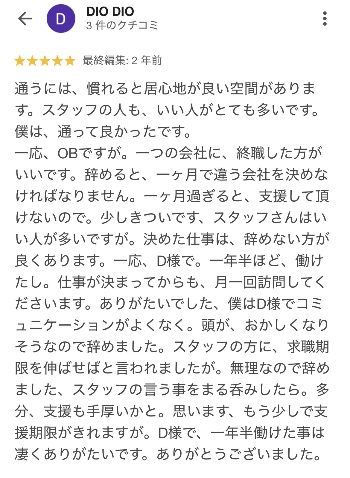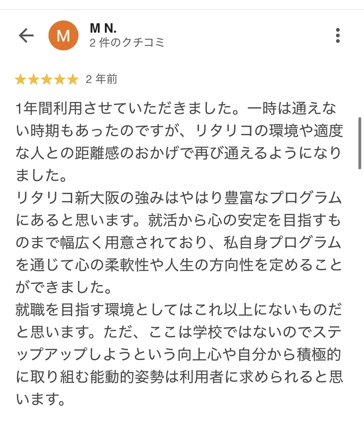現在は、人間関係◎業務内容◎の企業の一般雇用で働いています。(労働者として比べた時に大阪心斎橋の支援者より高待遇・好立地・良好な人間関係の中で働いていますw)リタリコ大阪心斎橋は誰にでも合うわけではありません。