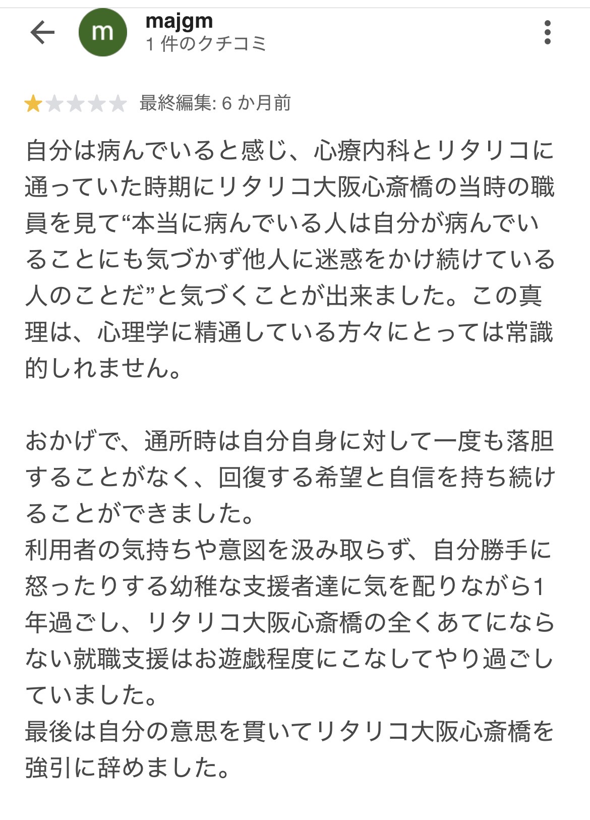また、流石に内容は書けませんが職業倫理さえもまともに理解していない支援者もリタリコ大阪心斎橋にはいるので注意が必要です。