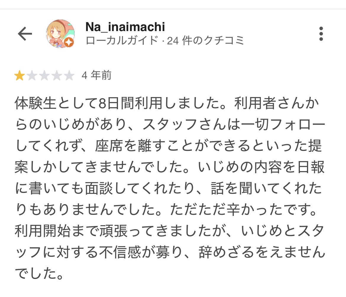 Screenshot体験生として8日間利用しました。利用者さんからのいじめがあり、スタッフさんは一切フォローしてくれず、座席を離すことができるといった提案しかしてきませんでした。