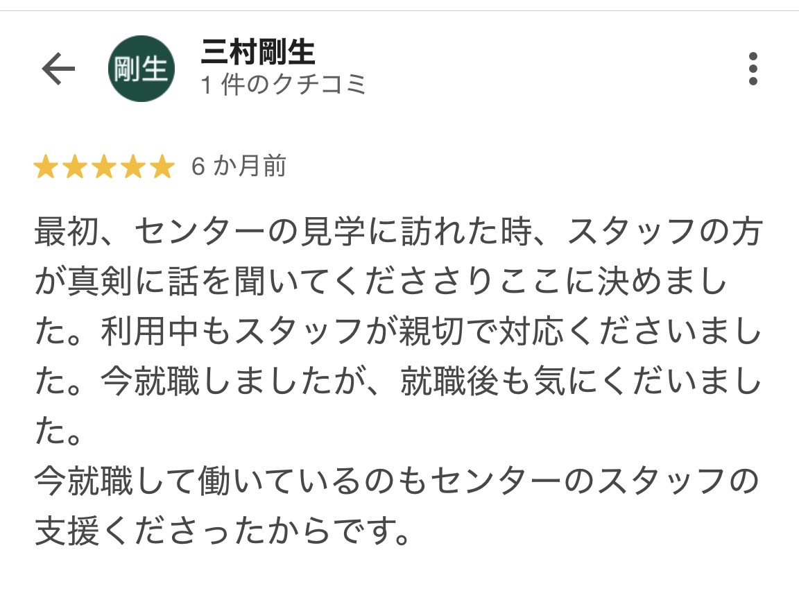 Screenshot最初、センターの見学に訪れた時、スタッフの方が真剣に話を聞いてくだささりここに決めました。利用中もスタッフが親切で対応くださいました。今就職しましたが、就職後も気にくだいました。